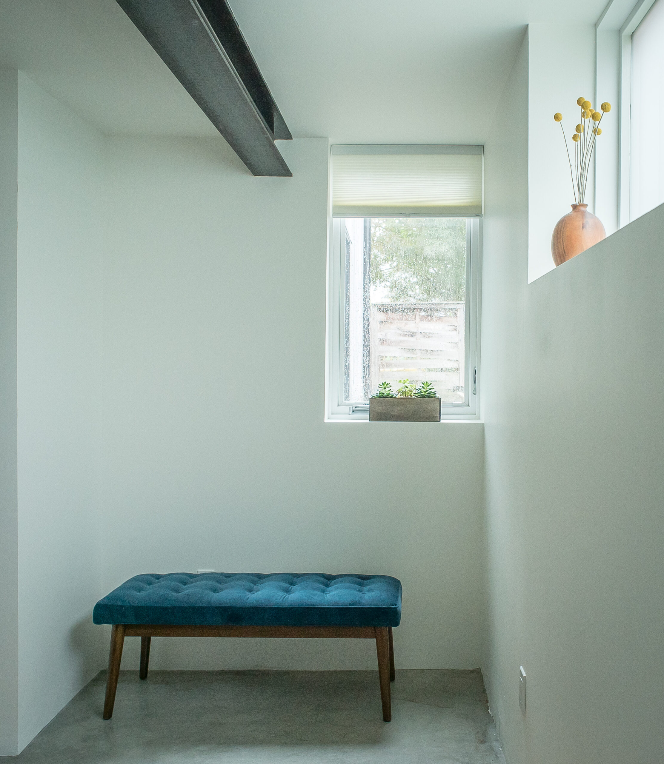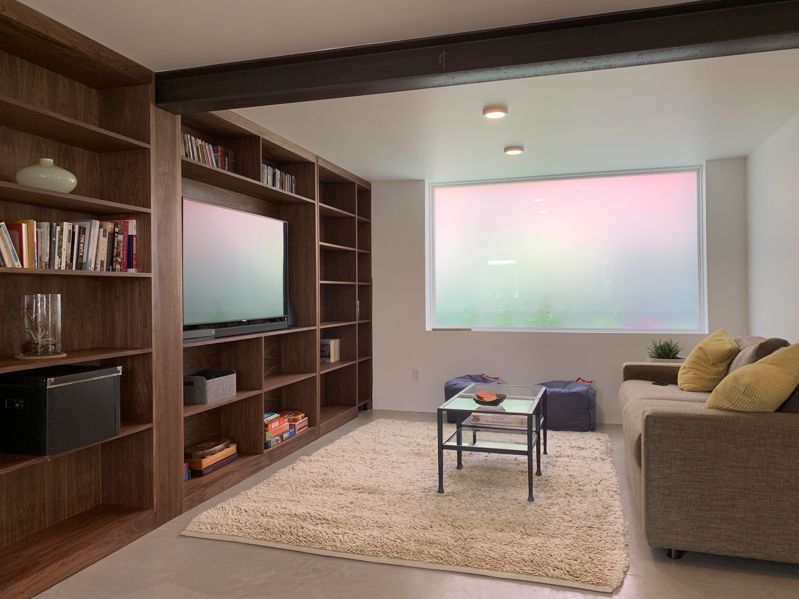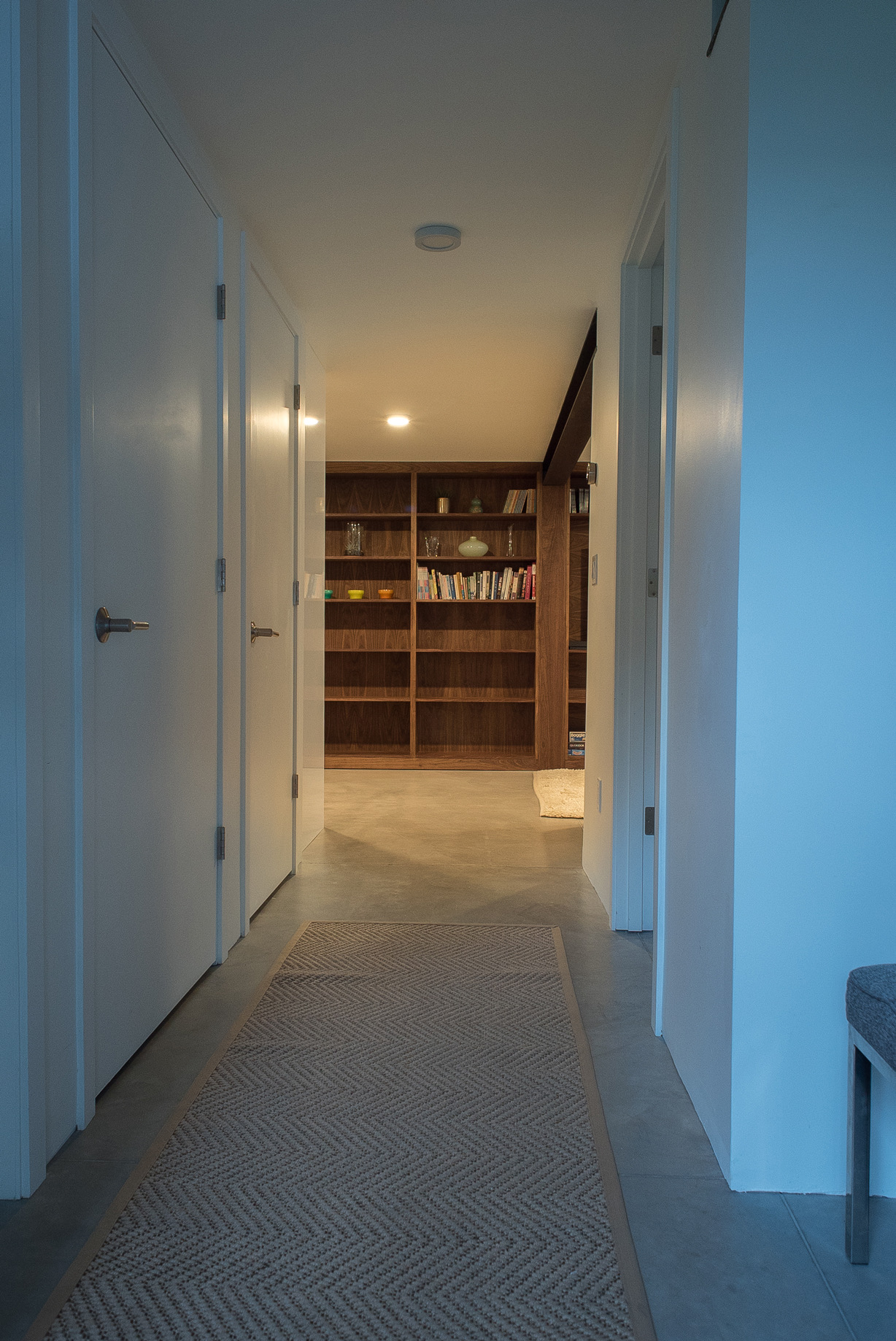 Conversion of an unfinished basement into an accessible, one bedroom apartment. Large frosted windows preserve privacy while transmitting tons of natural light. In-slab radiant heat make for cozy, silent and invisible heated floors.