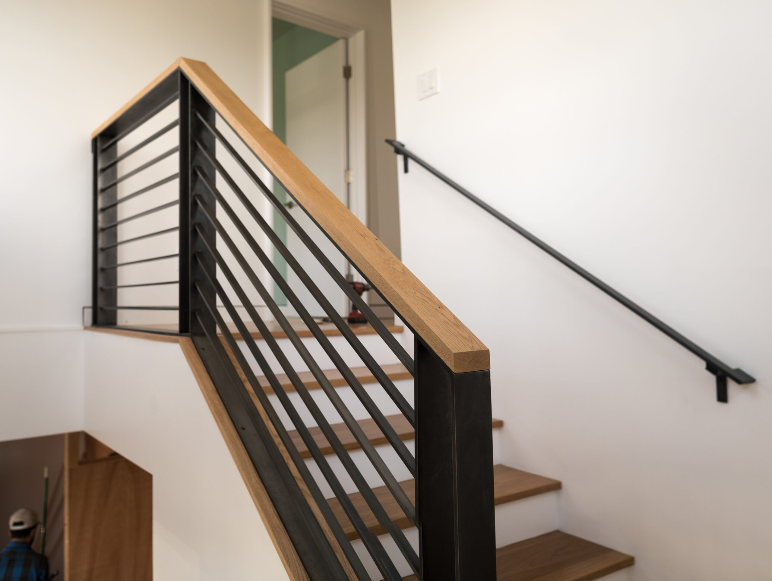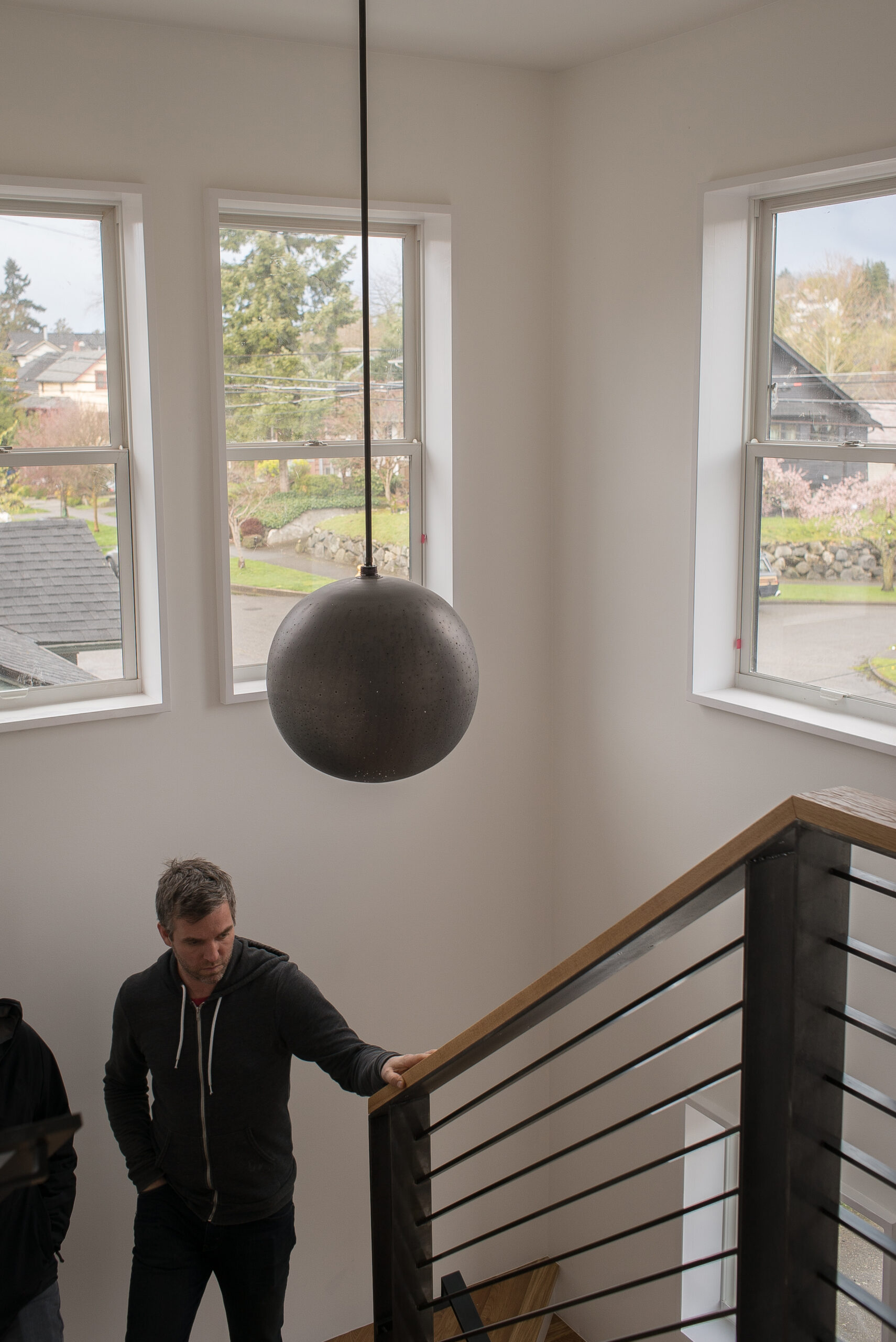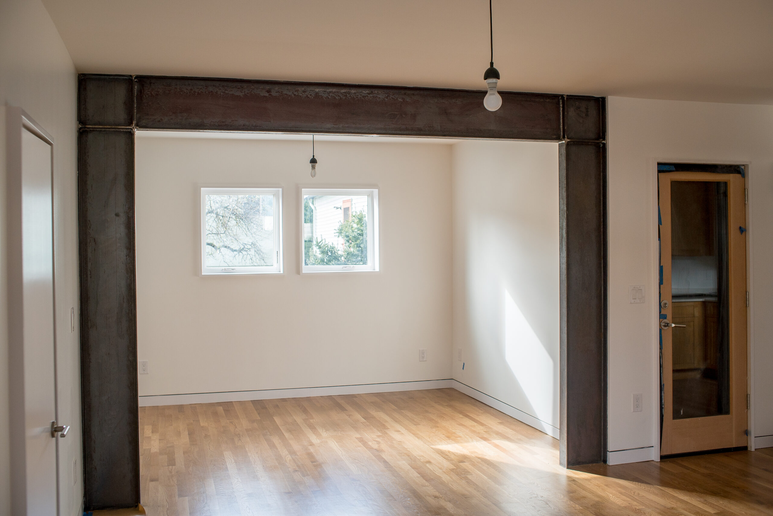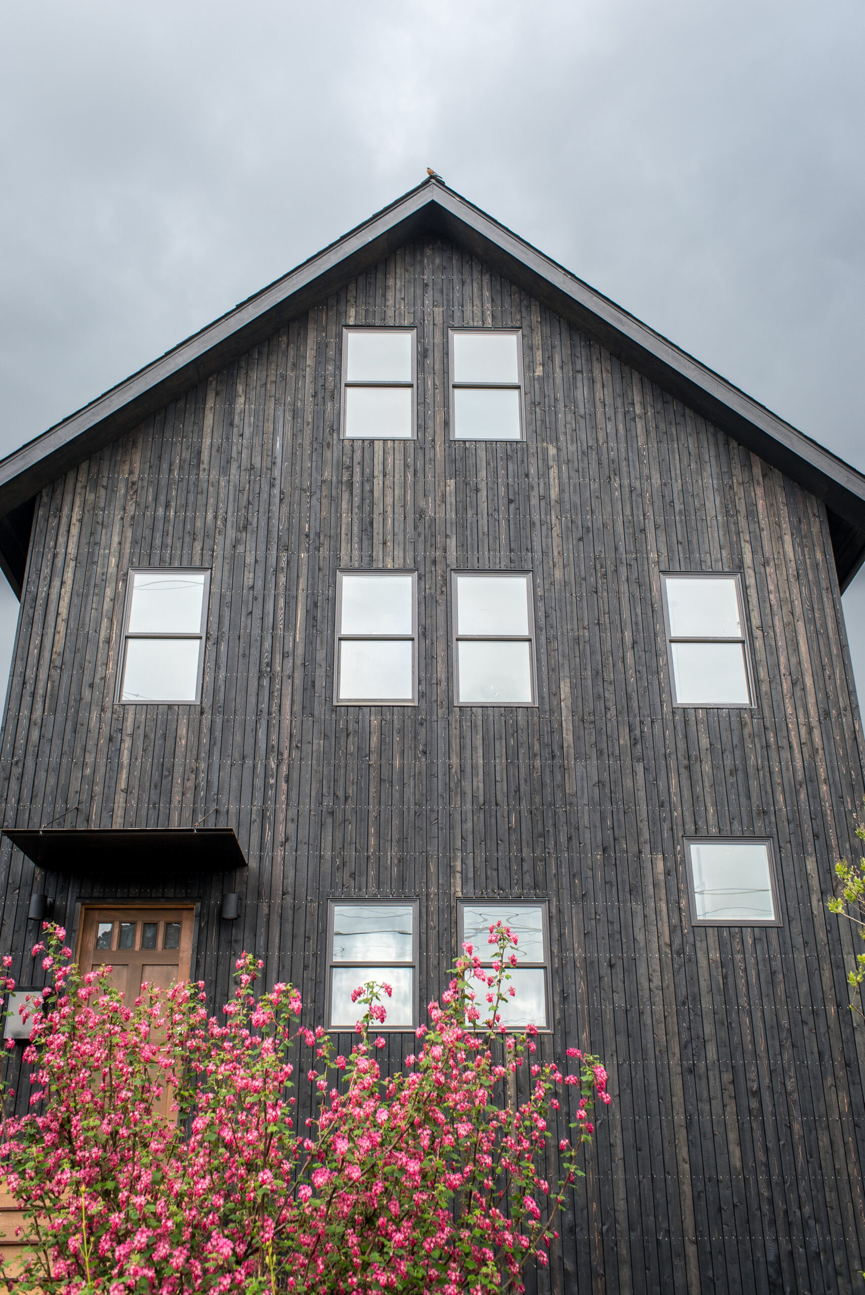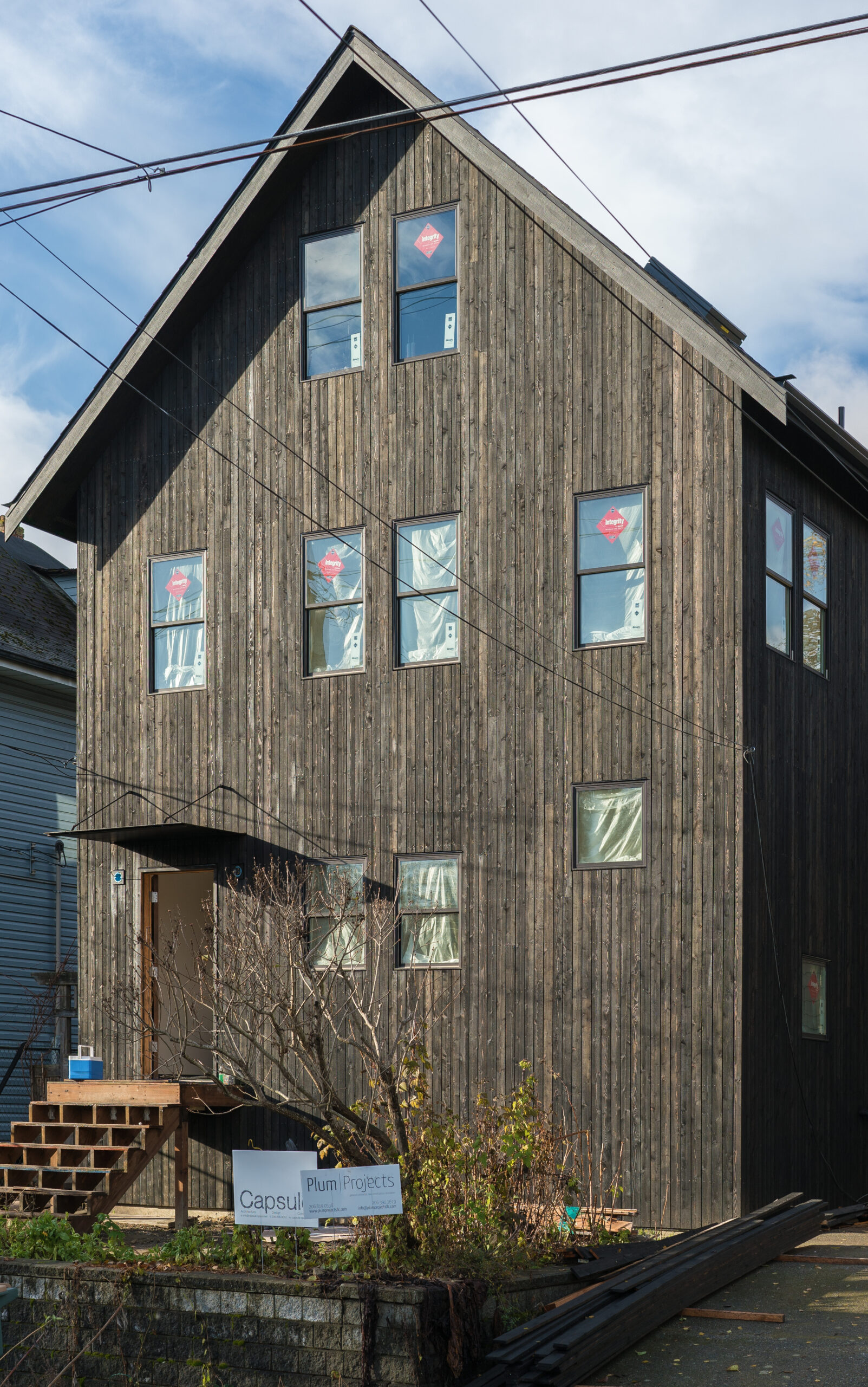This is a second-story addition and complete remodel of a small craftsman cottage. The exterior has a new rainscreen siding system with vertical cedar treated with black pine tar, a traditional finish providing durable, non-toxic preservation and very low maintenance. Interior details include portal window casings, flush baseboards, and several custom metal features.